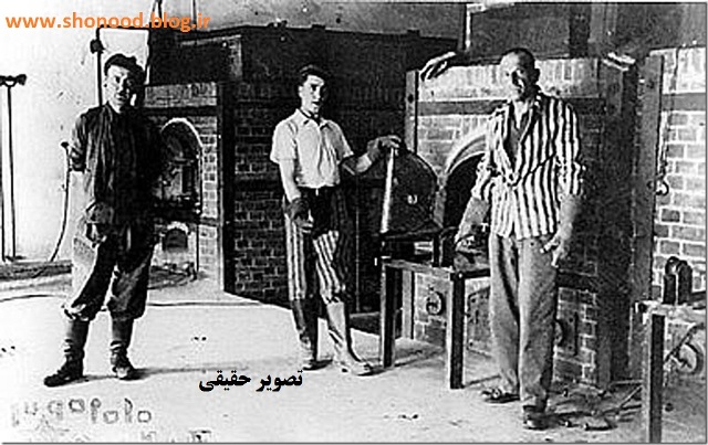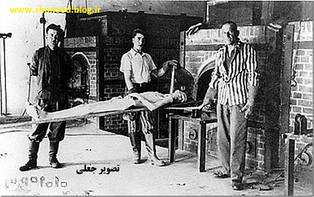 یک یهودی نحیف را که از گرسنگی در اردوگاههای نازی مرده است در کوره می سوزانند